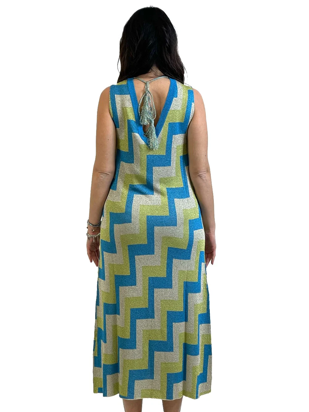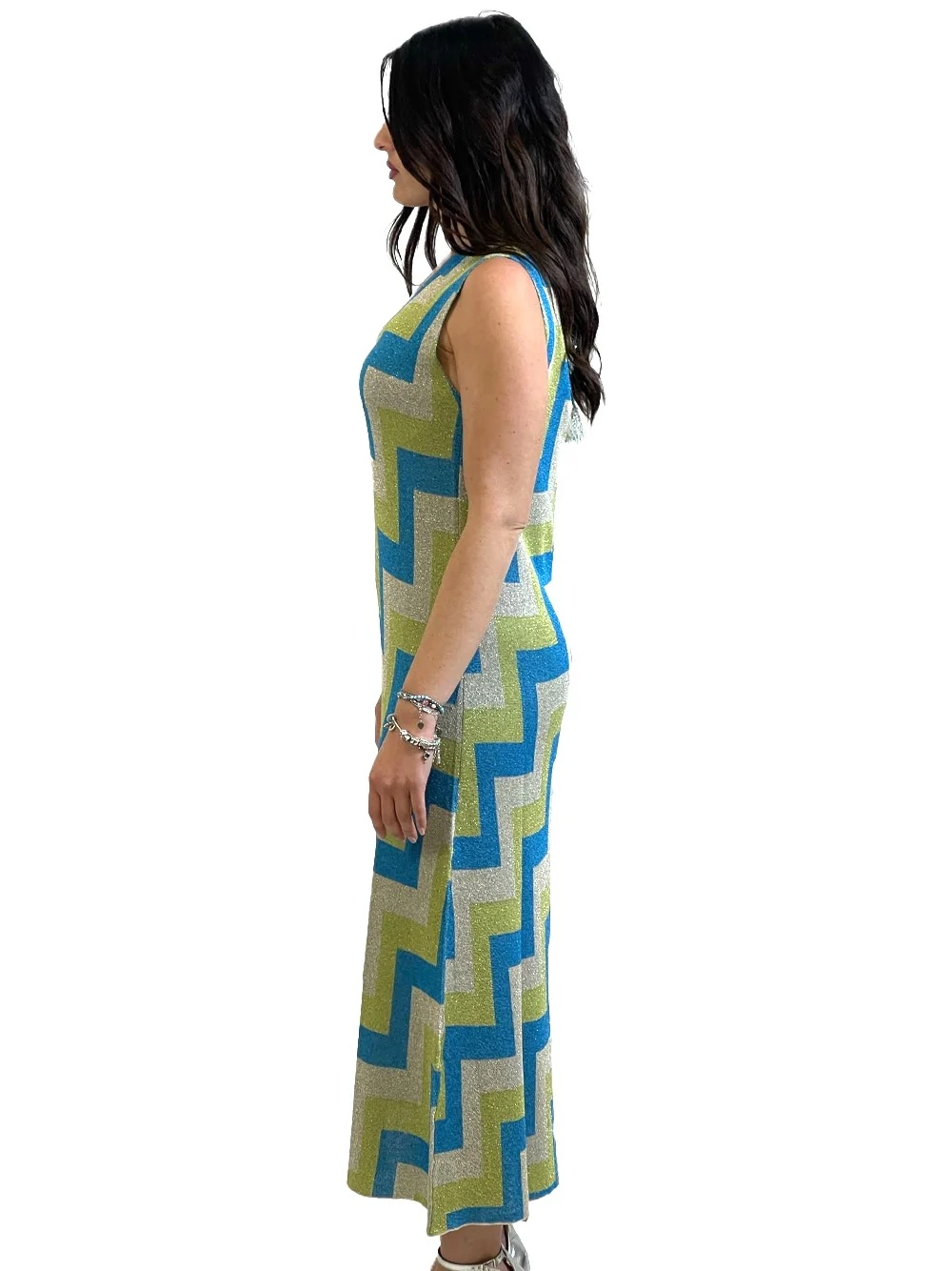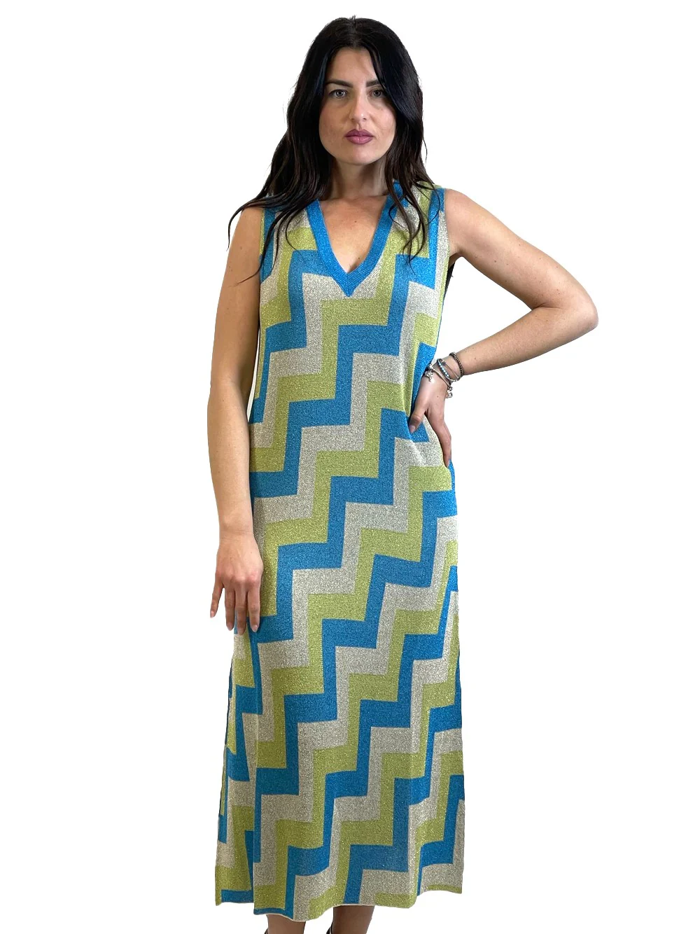 Abito lungo con vivace motivo zig-zag in jacquard e lurex. La vestibilità giromanica garantisce comfort e libertà di movimento, mentre il pattern zig zag aggiunge una texture dinamica e originale al tessuto. Il vestito ideale per chi desidera un look che catturi l’attenzione con stile e raffinatezza.