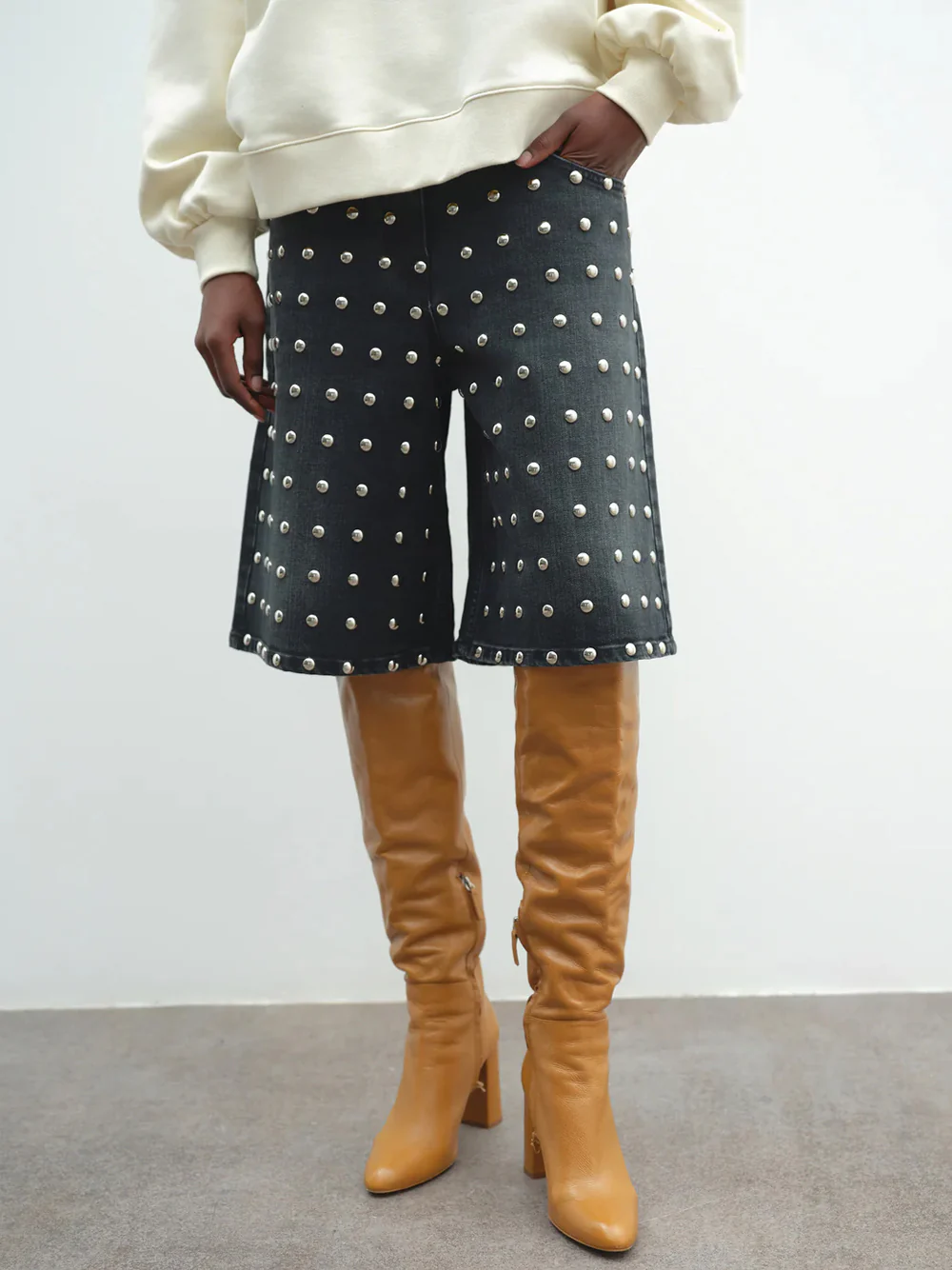 Dai un twist grintoso al tuo look invernale con il bermuda da donna in denim nero con borchie firmato Akep. Realizzato in denim, combina comfort e stile grazie al design relaxed fit, la vita media e i dettagli di borchie applicati lungo la gamba. Ideali per look streetwear, casual o rock-chic, questi shorts in jeans sono versatili e facilmente abbinabili per look urbani e decisi.