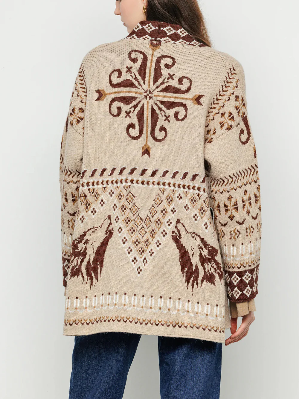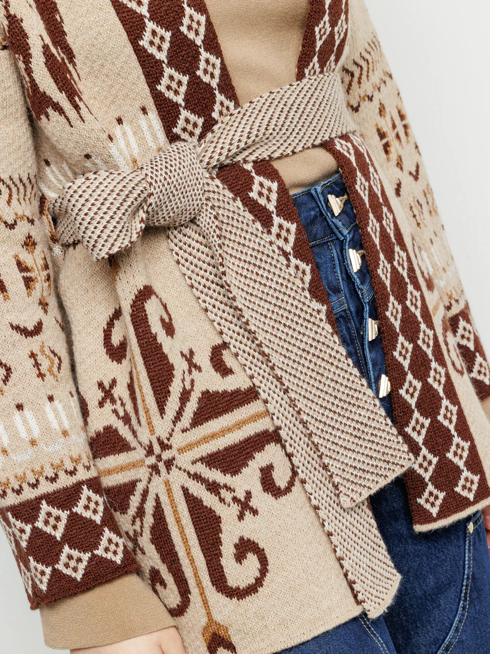 Cardigan in misto lana merinos, tessuto in jacquard con apertura sul davanti, con cintura da annodare in vita. Perfetto da coordinare con abiti corti e lunghi