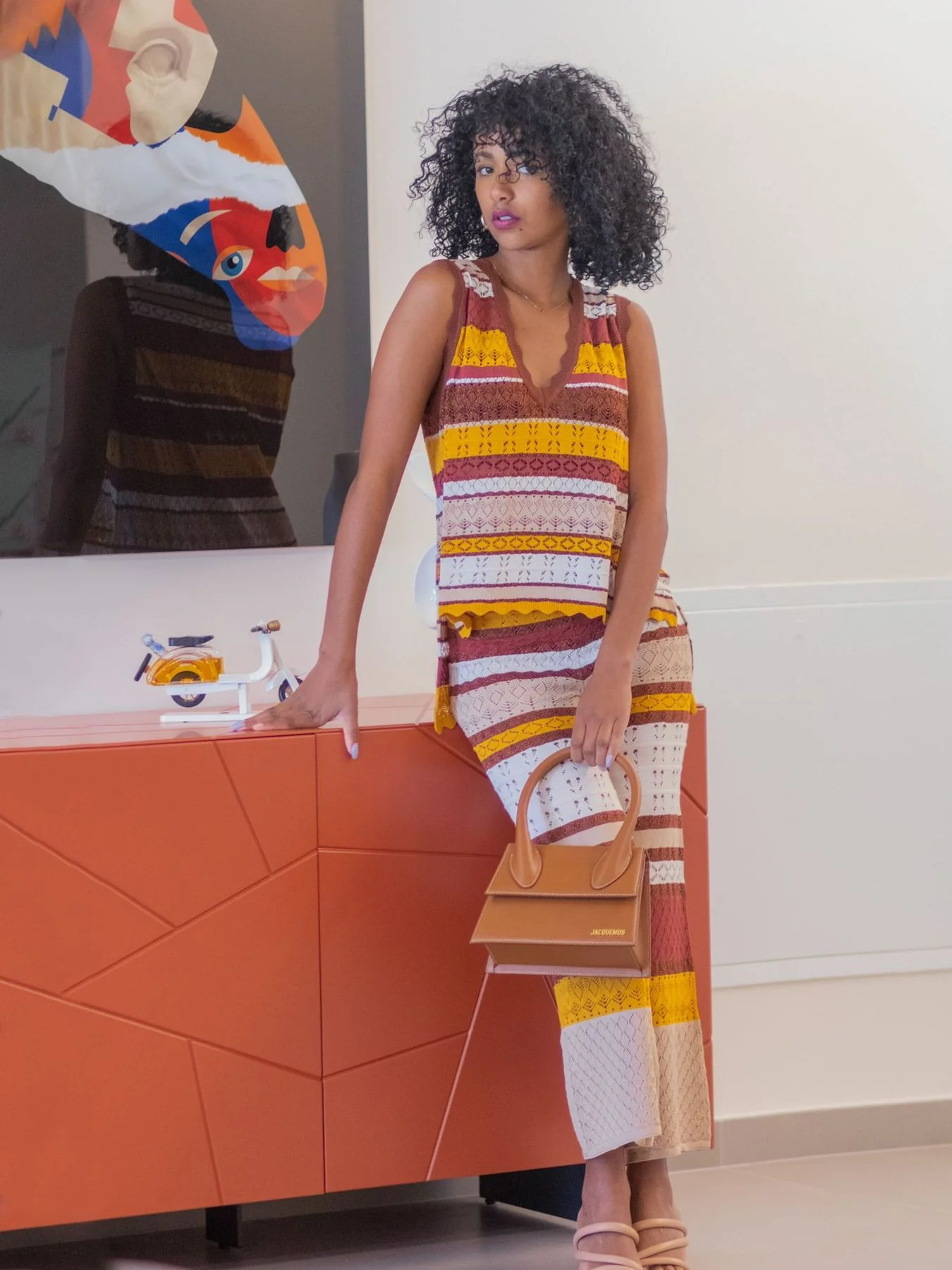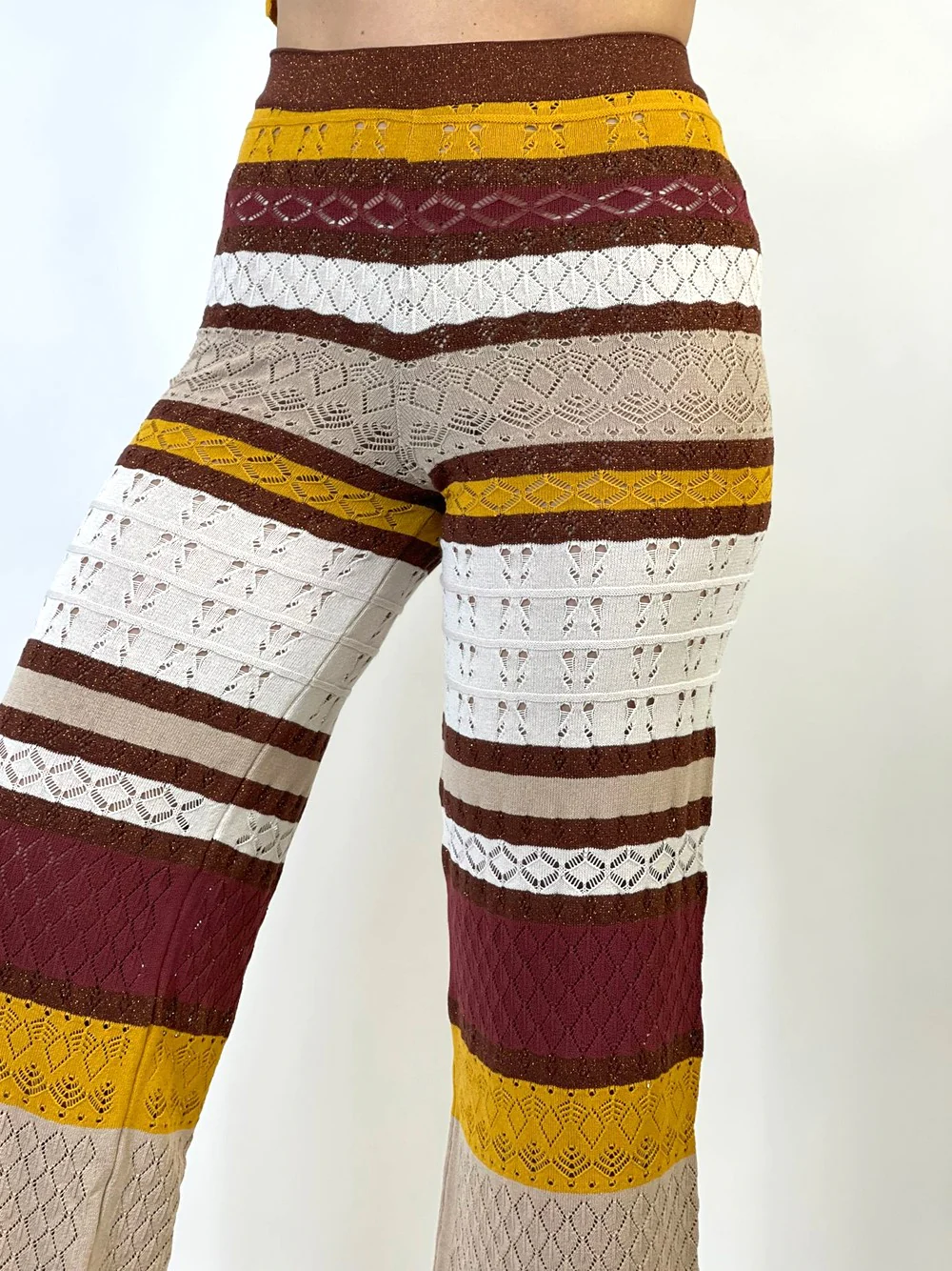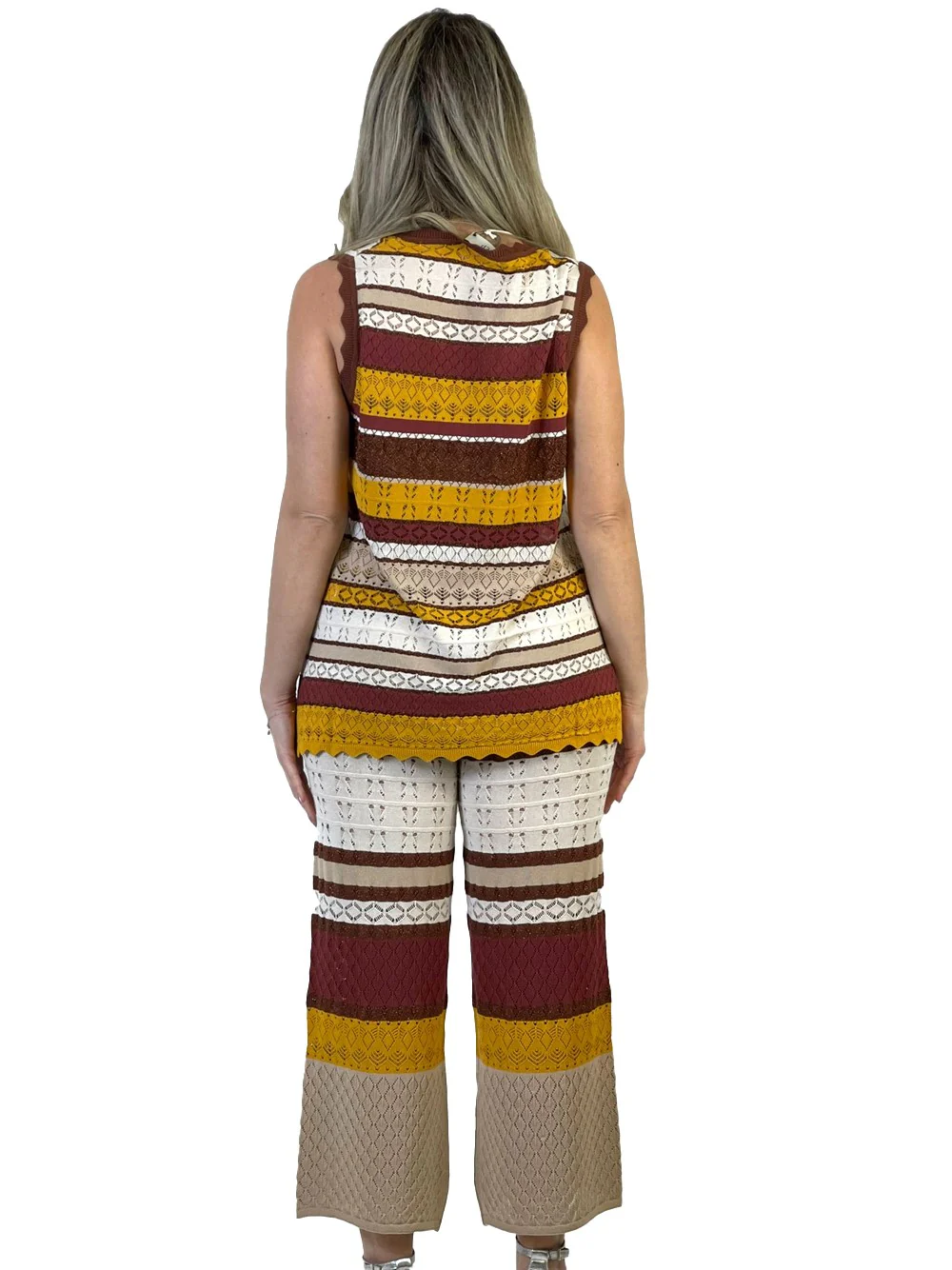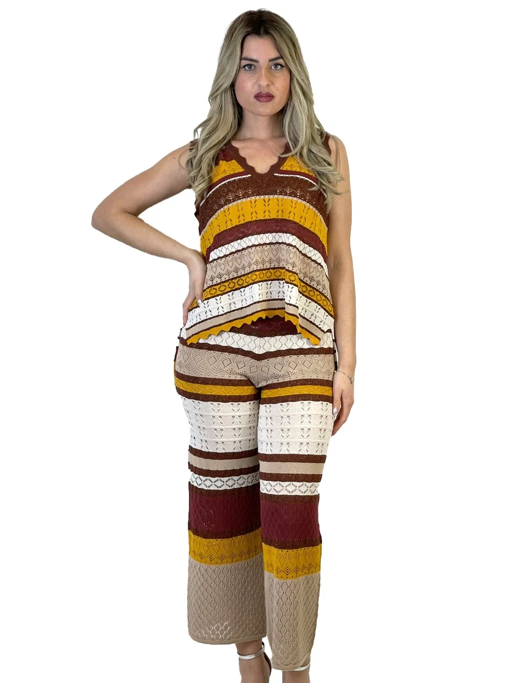 Coordset in maglia, trama forata composto da canotta over scollo a V e pantalone con vita elasticizzata.