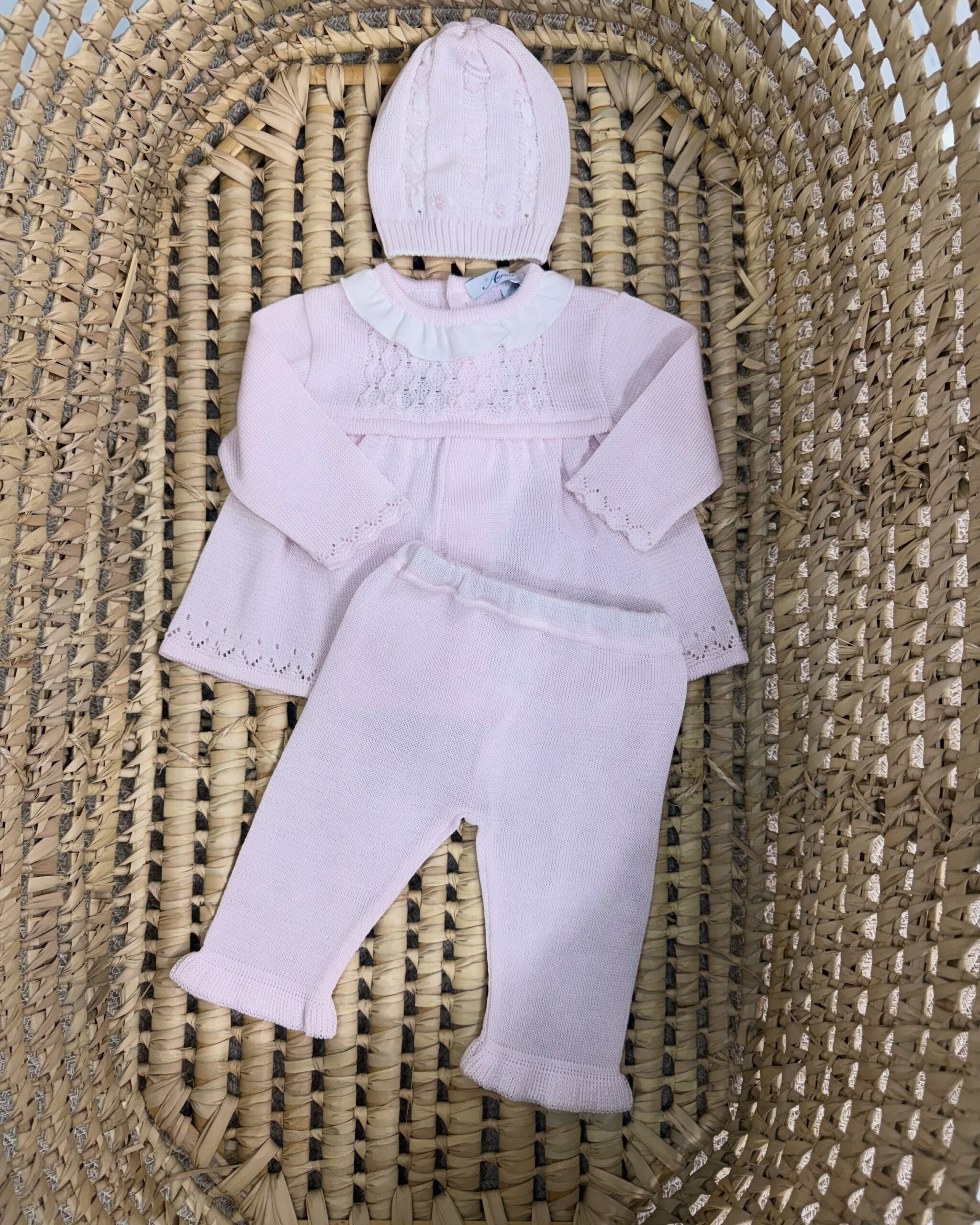 Completo uscita clinica neonata comprende; Completo due pezzi in puro filo di cotone e cappello coordinato