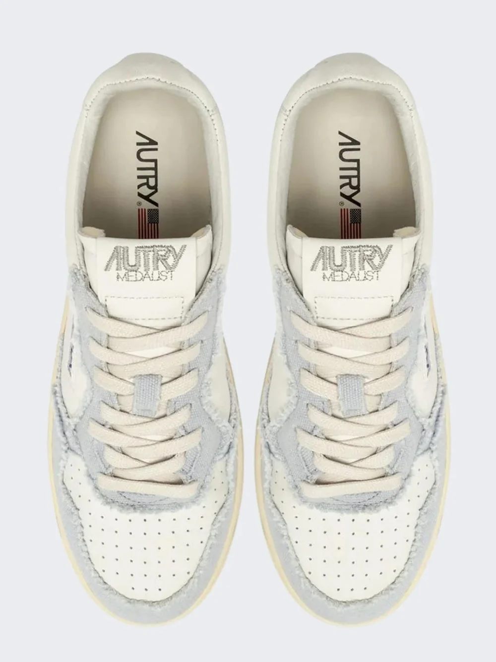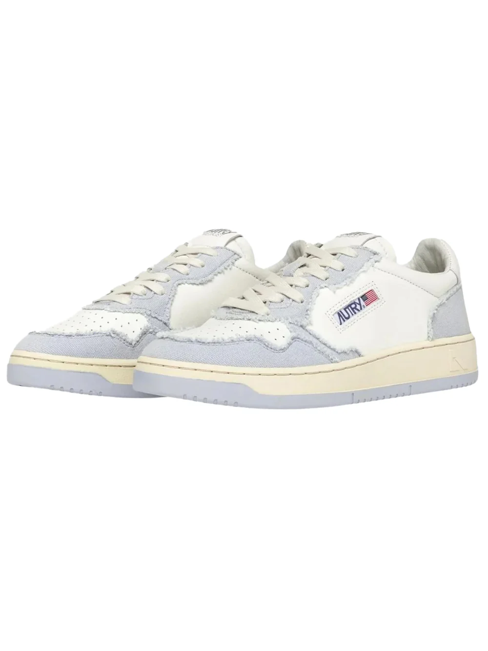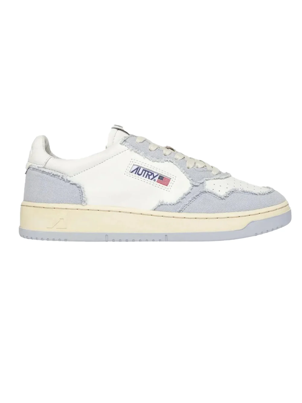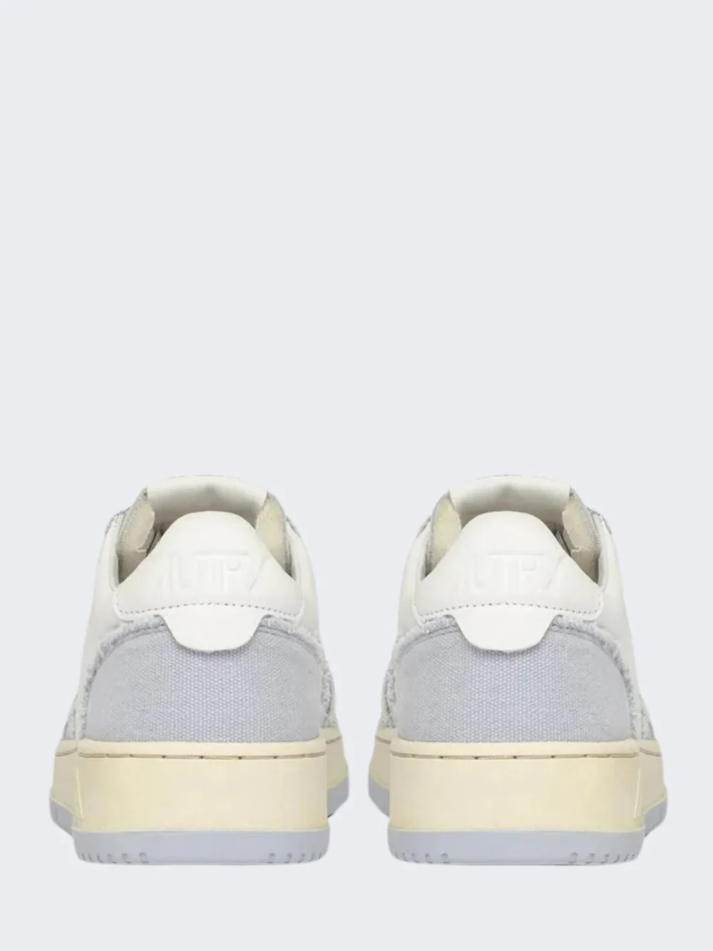 Tomaia in pelle bianca e canvas celeste con impunture che definiscono gli inserti multistrato.