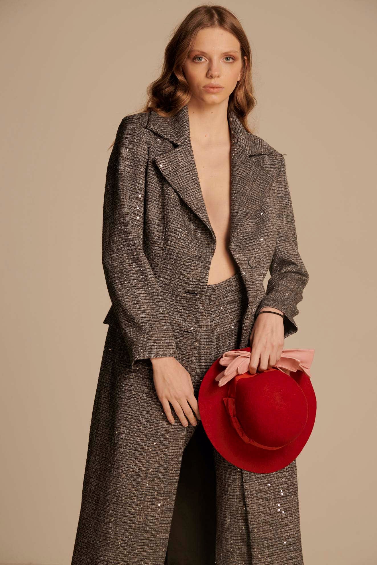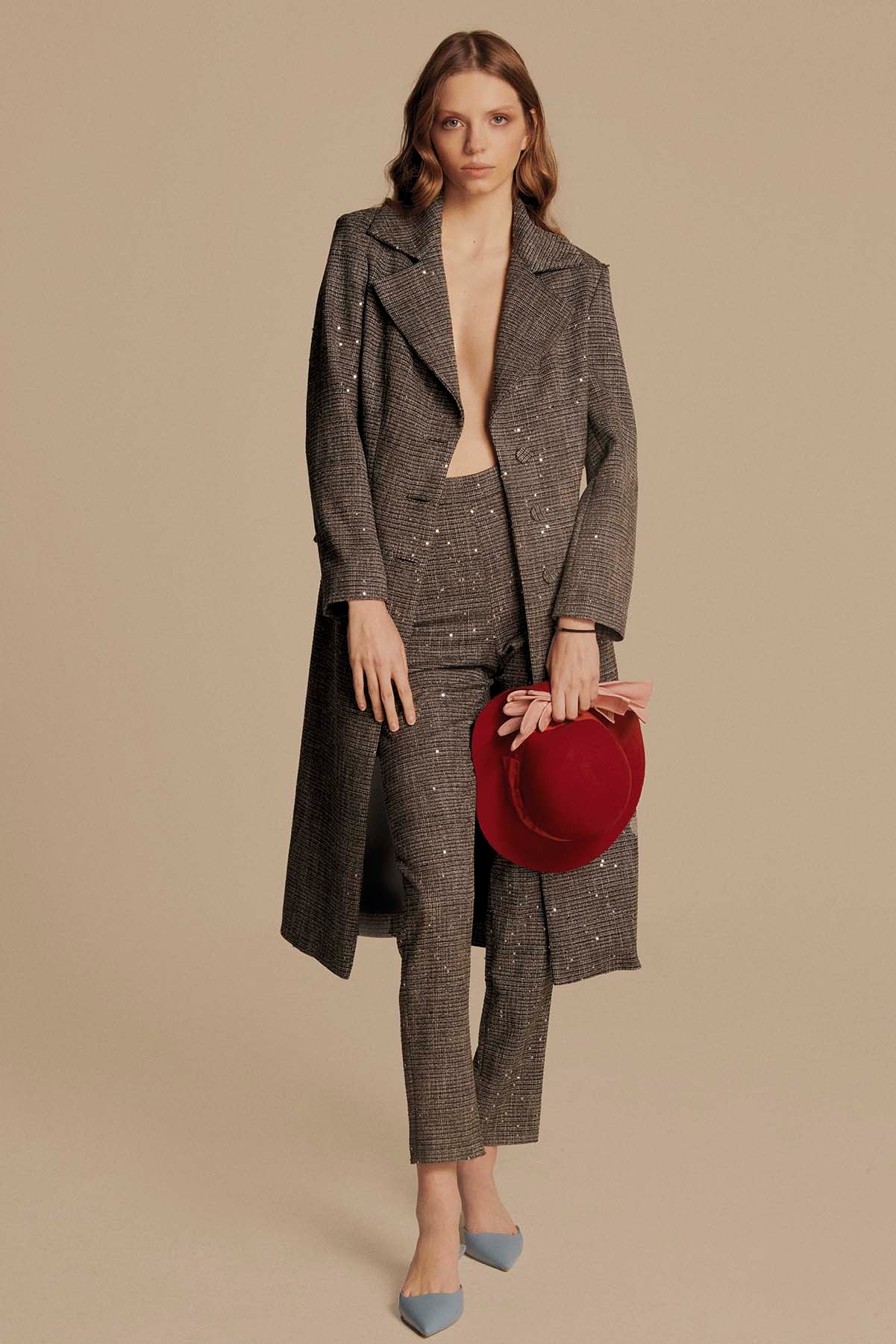Cappotto sartoriale, realizzato in cady con paillettes ricamate.