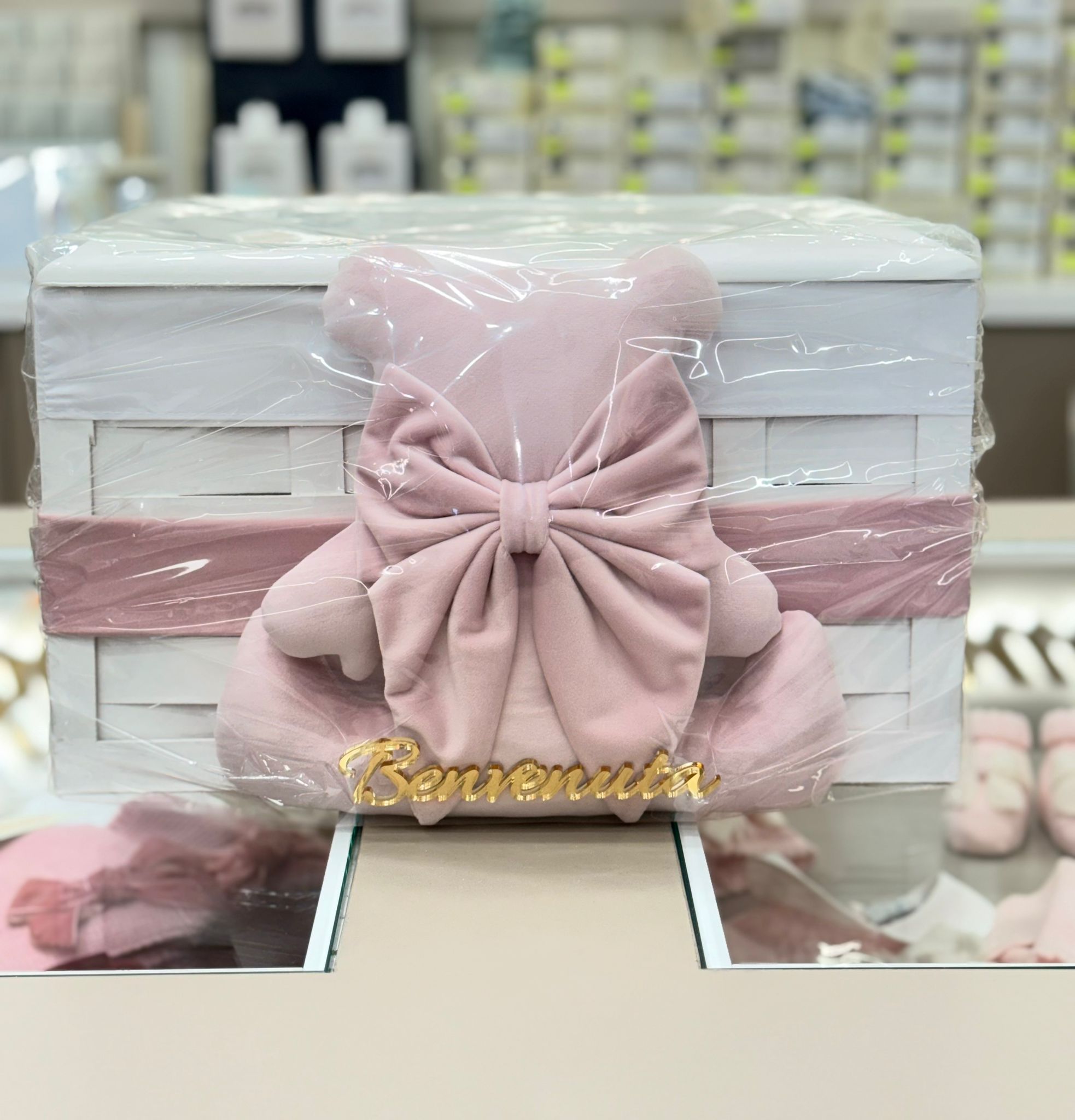 CESTA IN LEGNO BENVENUTA TEDDY ROSA