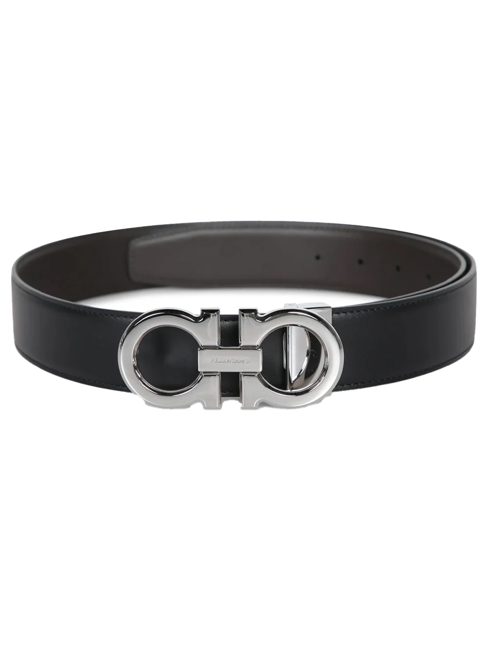 Questo accessorio Ferragamo coniuga eleganza e funzionalità grazie alla pelle di alta qualità e alla caratteristica fibbia Gancini in metallo lucido, esempio di raffinata artigianalità italiana. In pelle liscia reversibile nero/marrone. Altezza 4 cm.