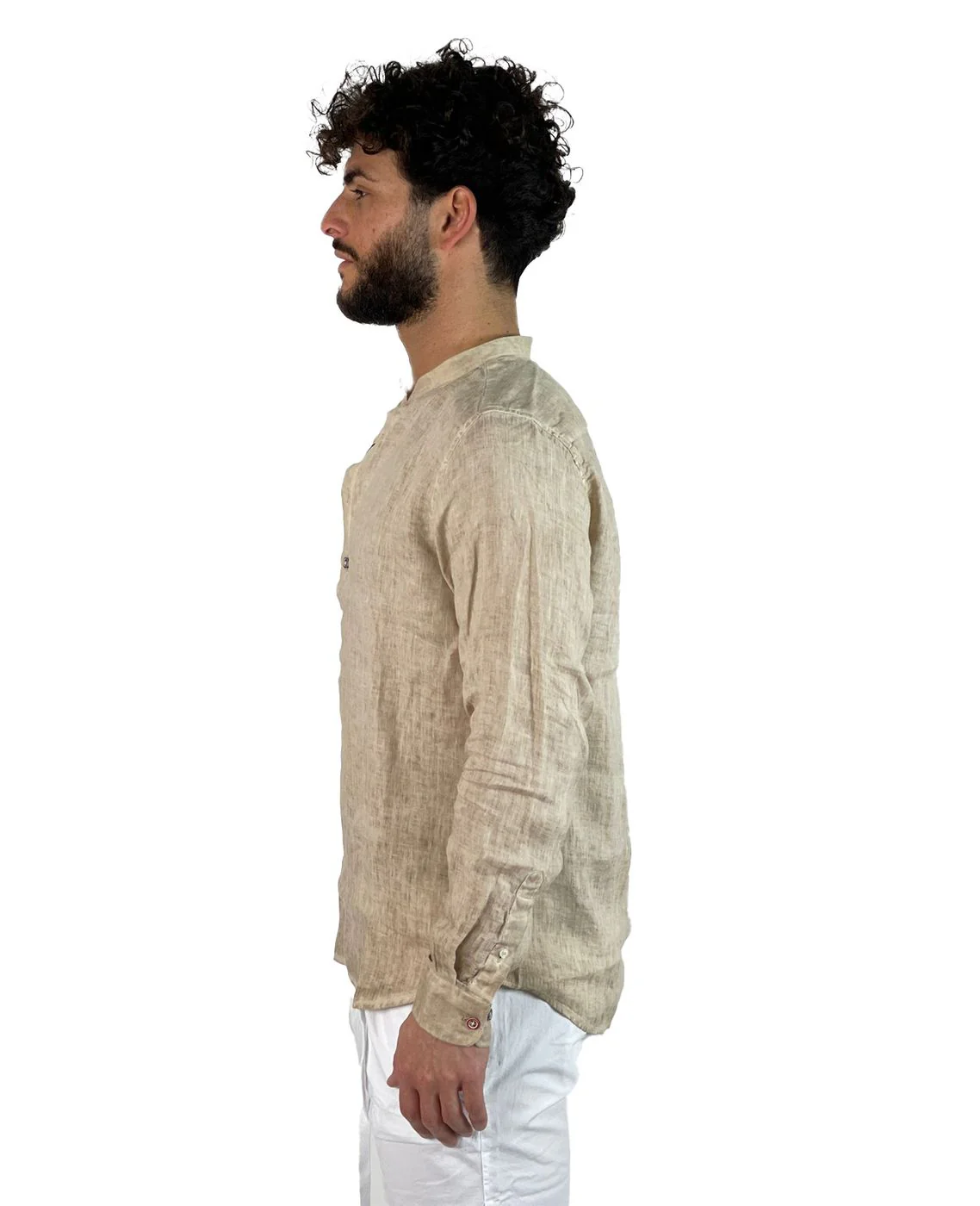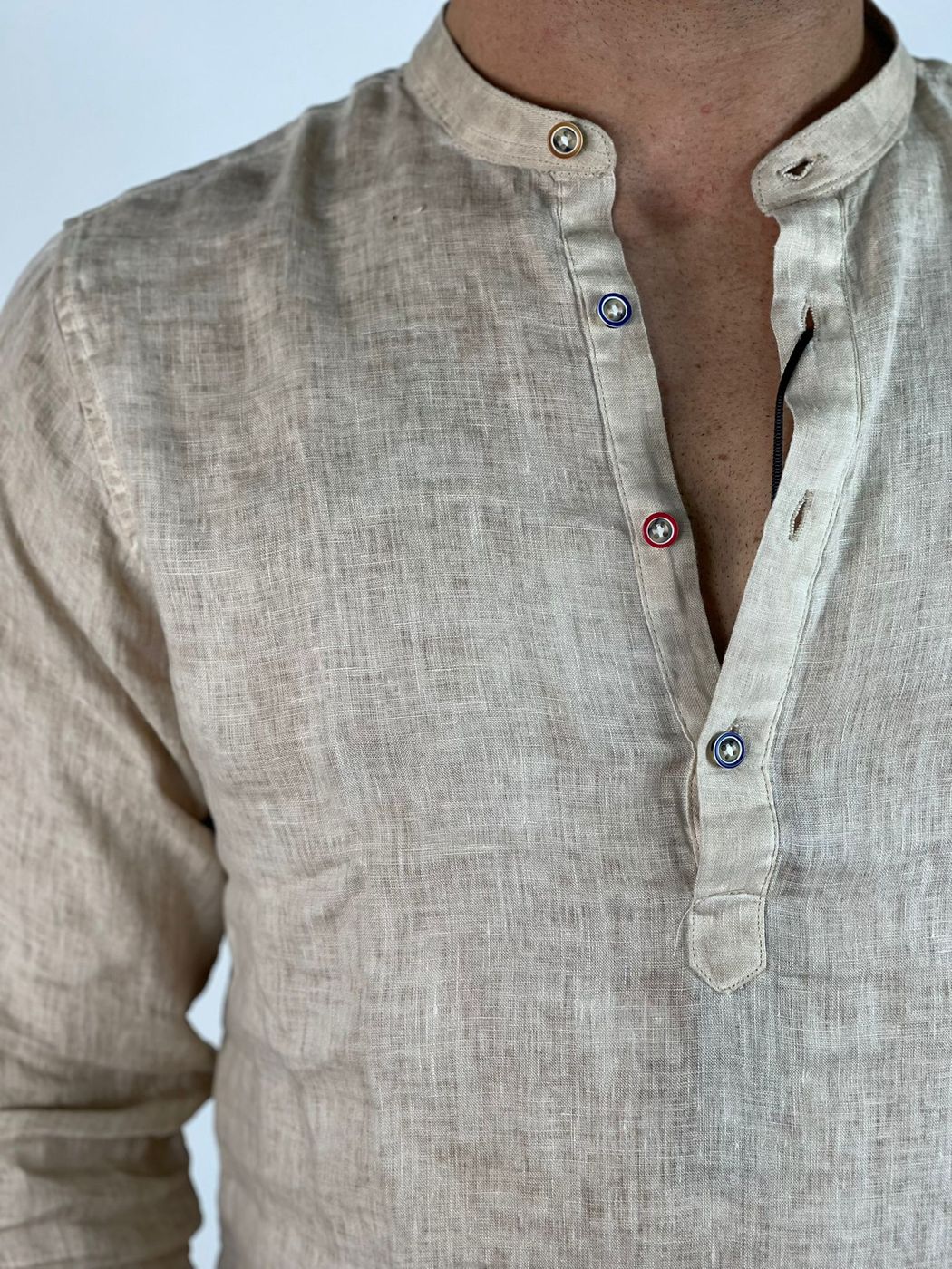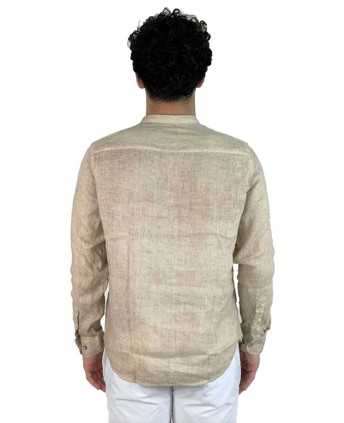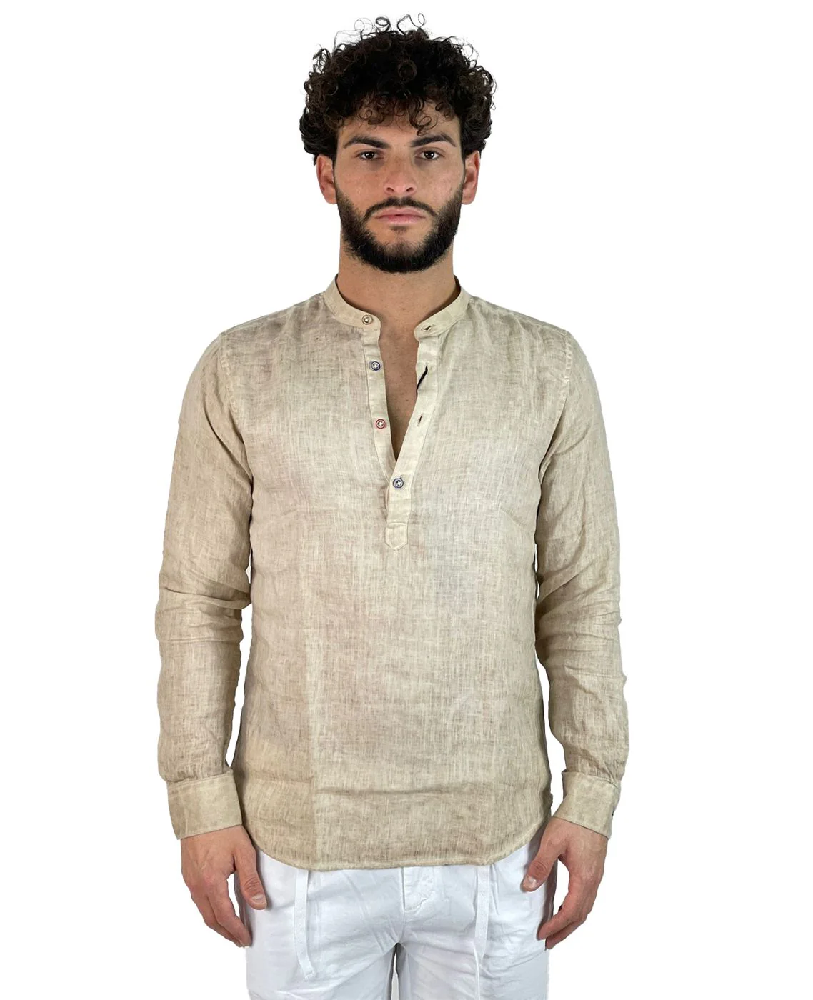 Camicia 100% lino con chiusura bottoncini e taschini frontali.
