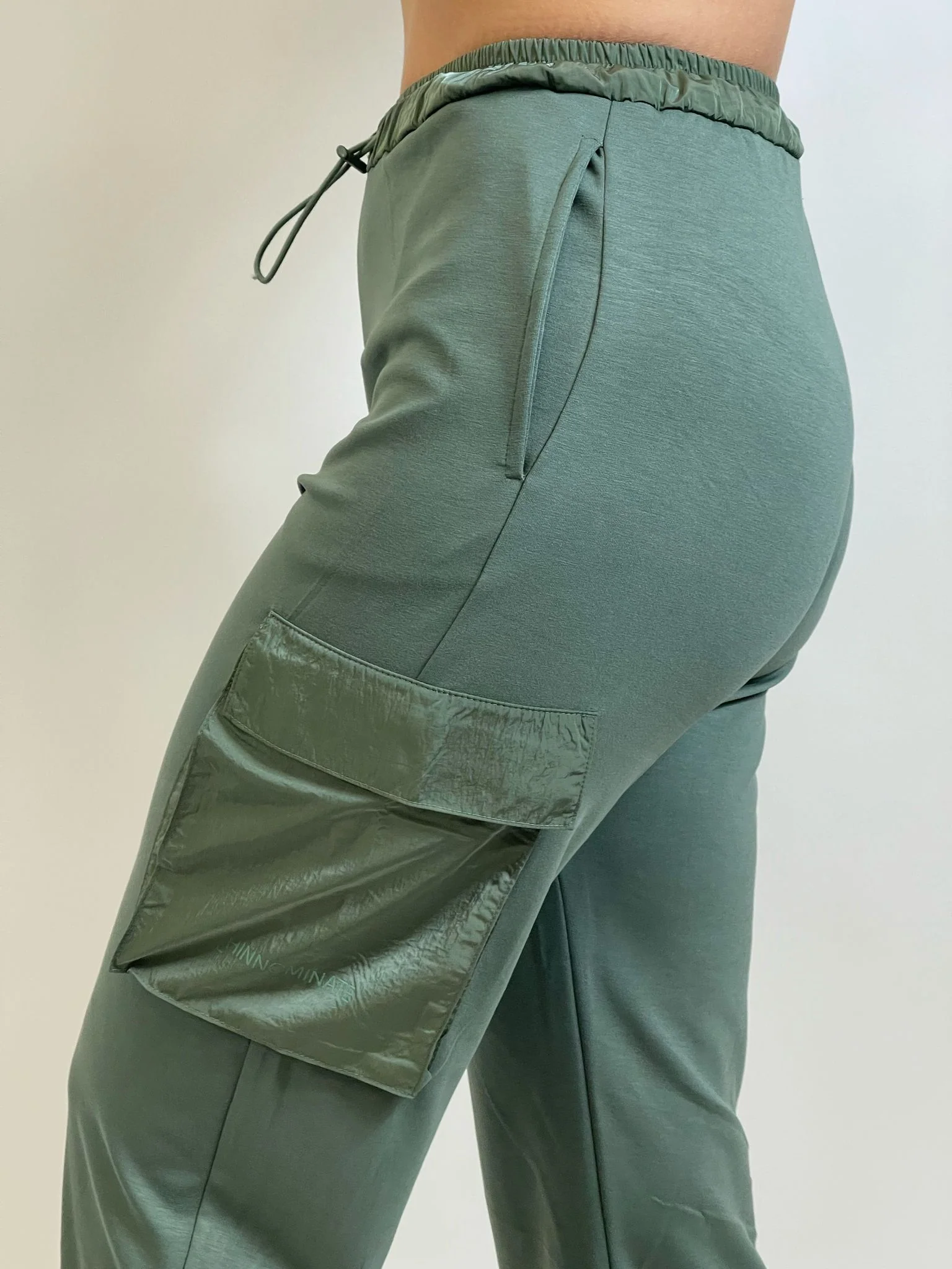 Pantalone cargo in modal con dettaglio vita in nylon e coulisse. Tasconi laterali in nylon.