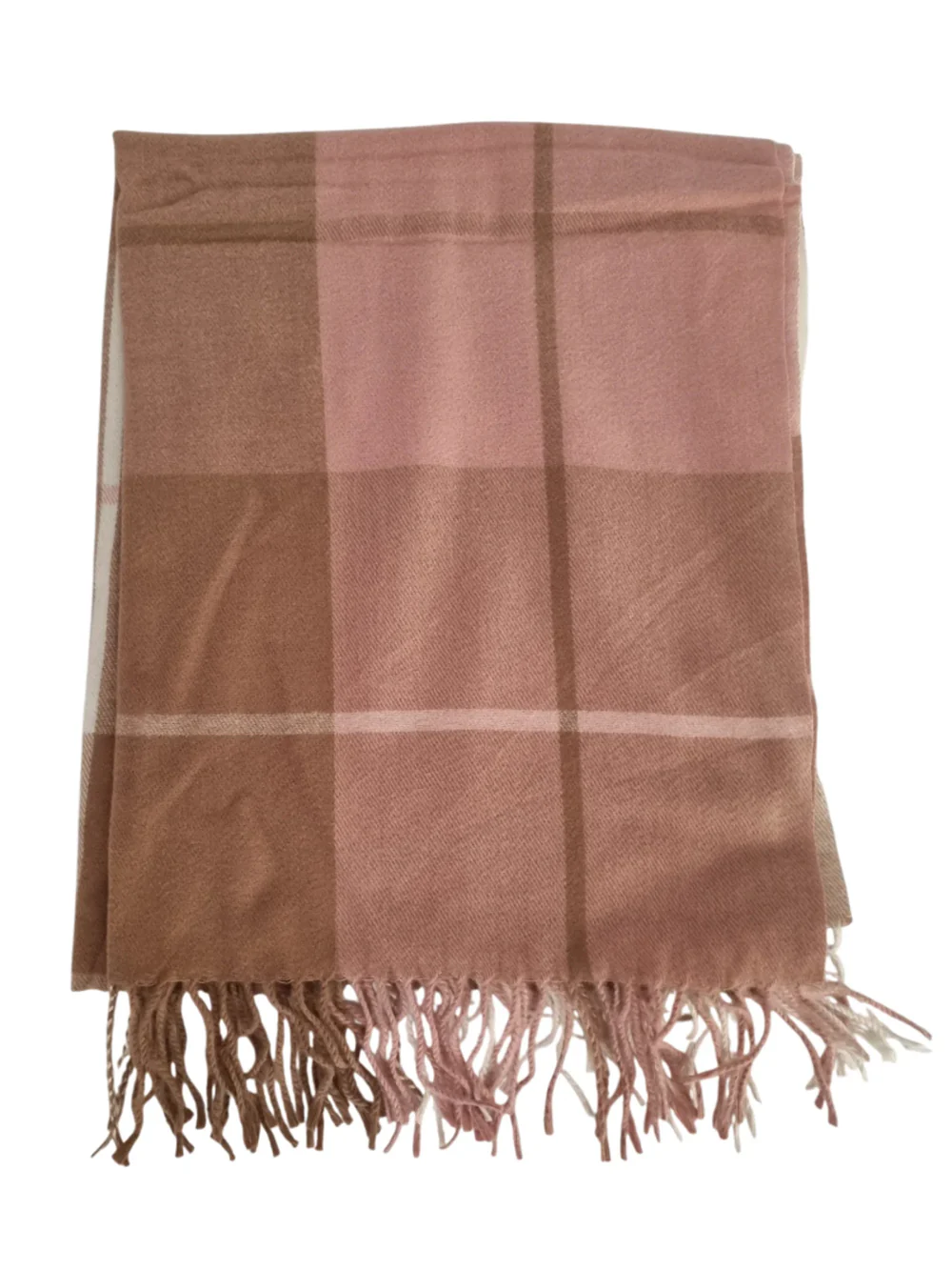Sciarpa fantasia a quadri con frange sul fondo rosa e beige.