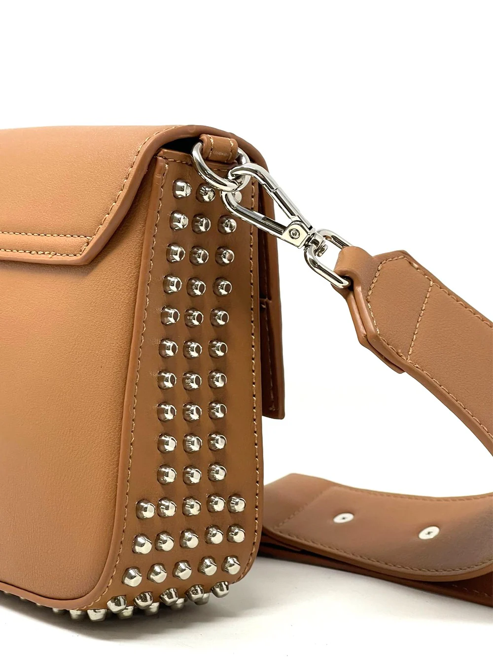 Borsa firmata John Richmond eco-pelle grano liscio, borchie laterali e sul fondo, piano pieghevole con chiusura magnetica, maniglia superiore singola staccabile, due spallacci regolabili staccabili, stampa del logo sul davanti, scomparto principale, fodera logo-jacquard. Dimensioni 27 x 14 x 6 cm.