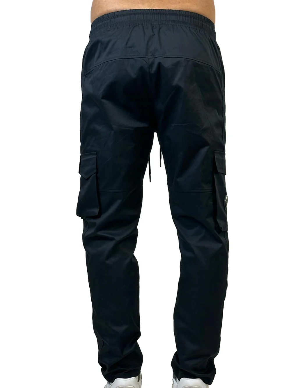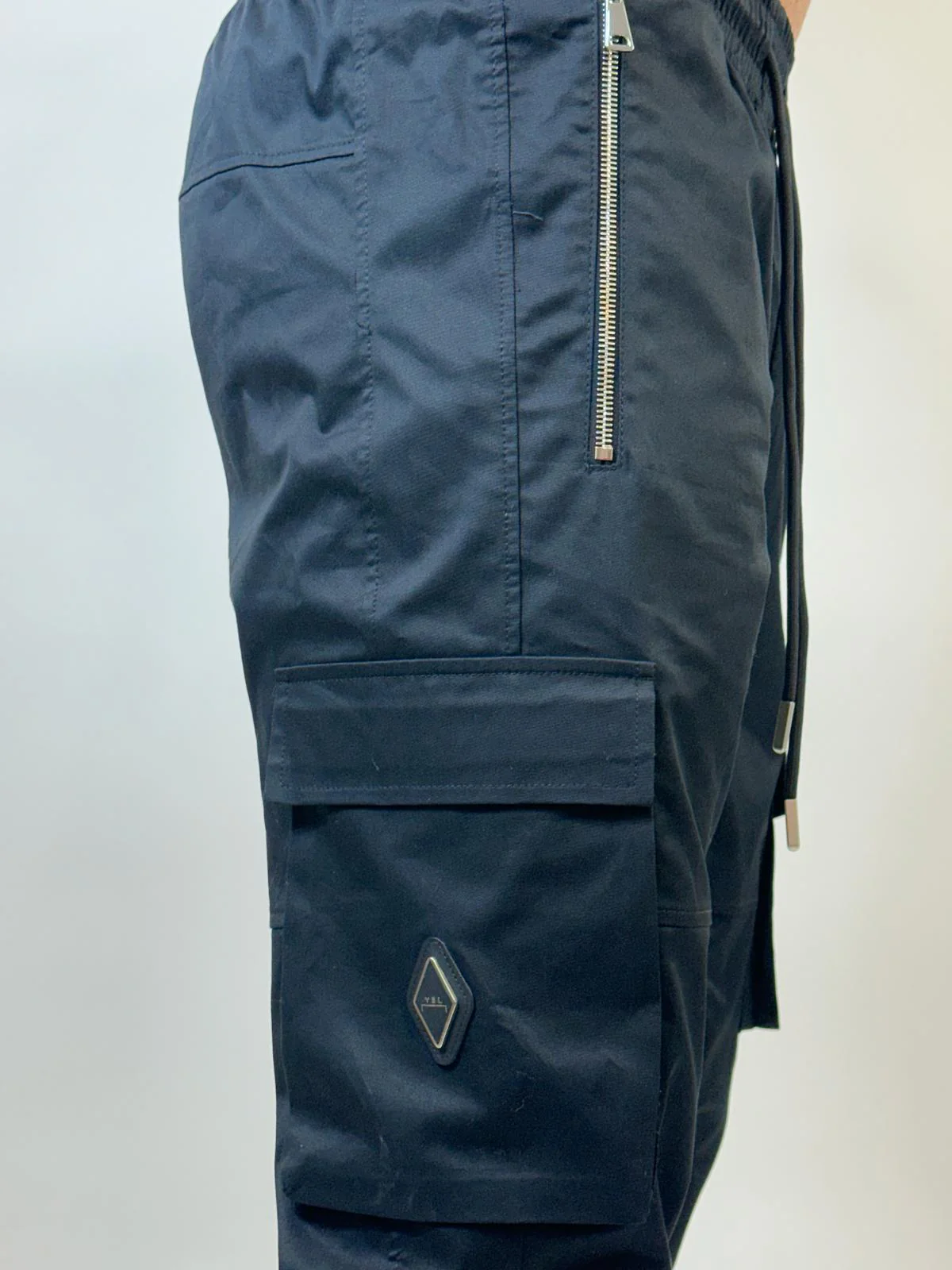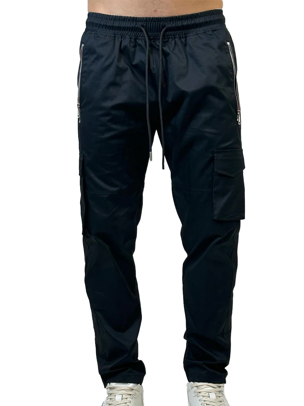 Pantalone in cotone modello cargo con multitasche. Vita elasticizzata e coulisse. Zip laterale. Logo in metallo.