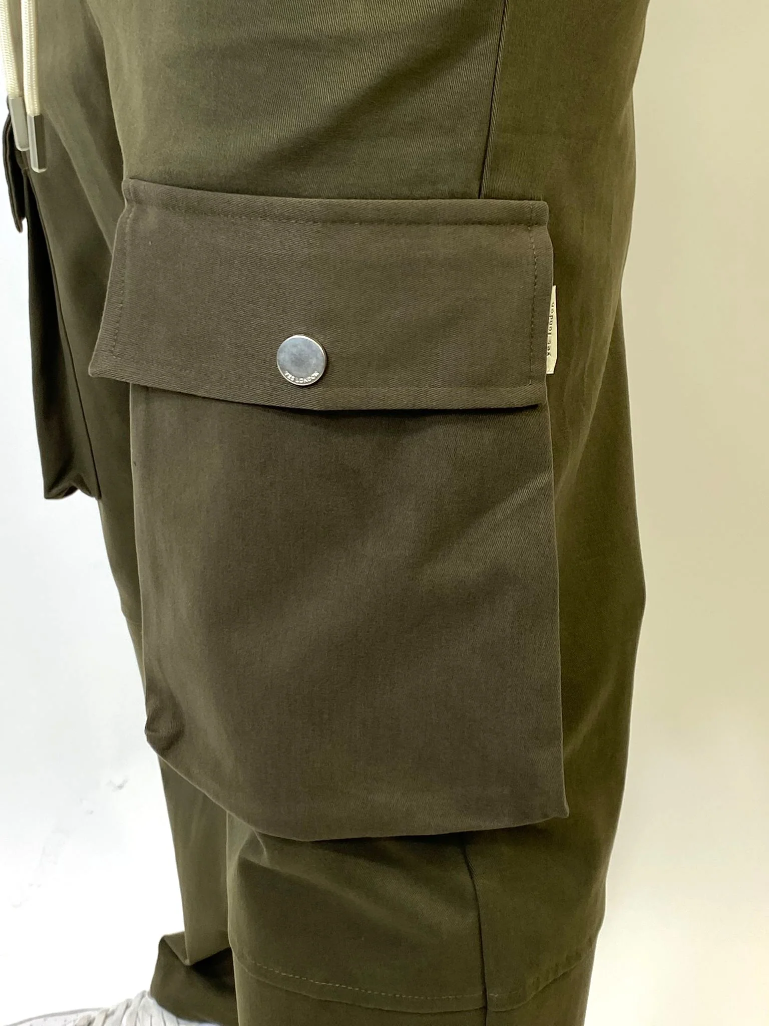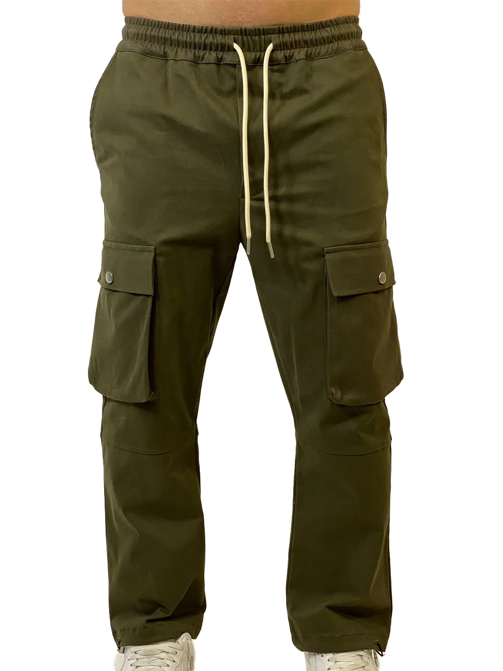 Pantaloni cargo verde muschio con vita elasticizzata e coulisse, tasconi sulle gambe. Fondo regolabile.