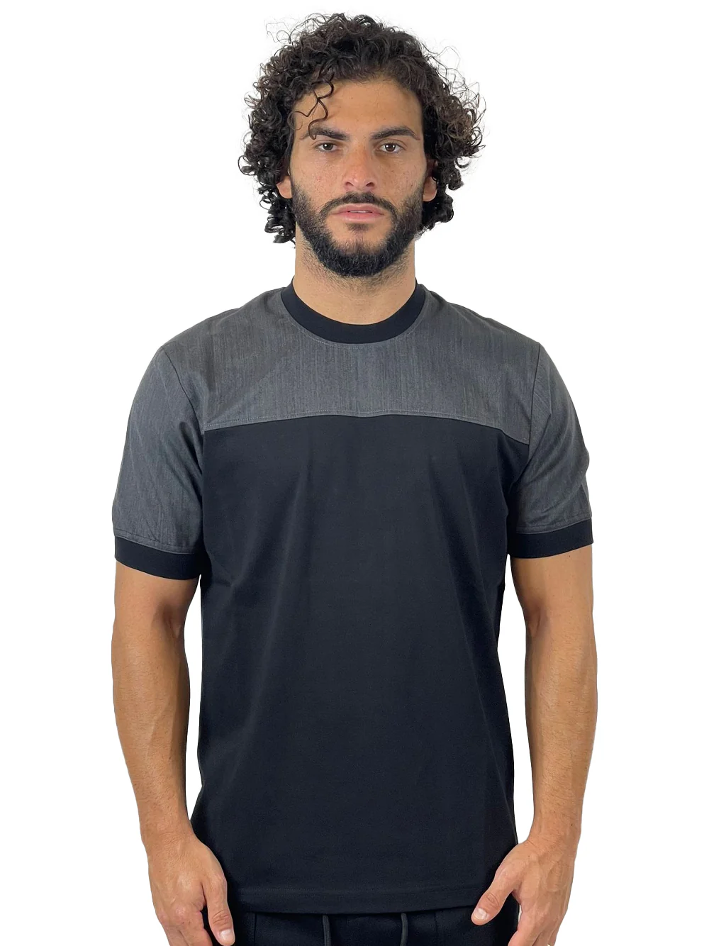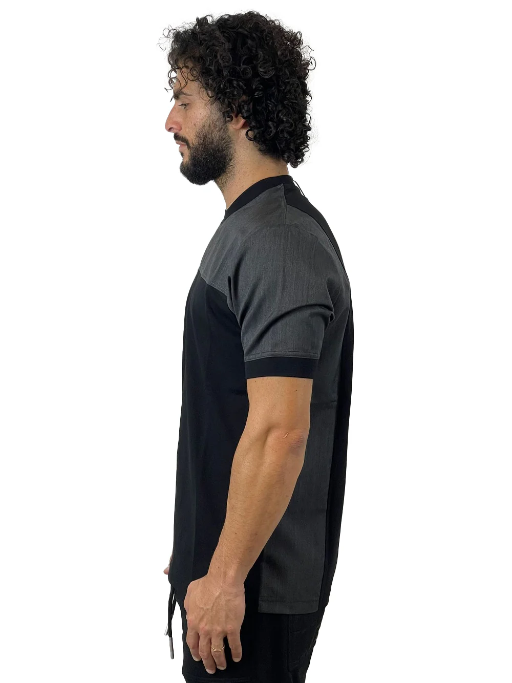 T-shirt manica corta con riporti in lana antracite. Girocollo.
